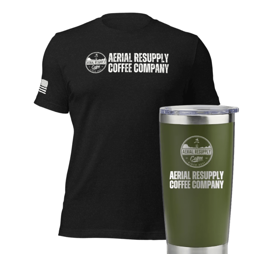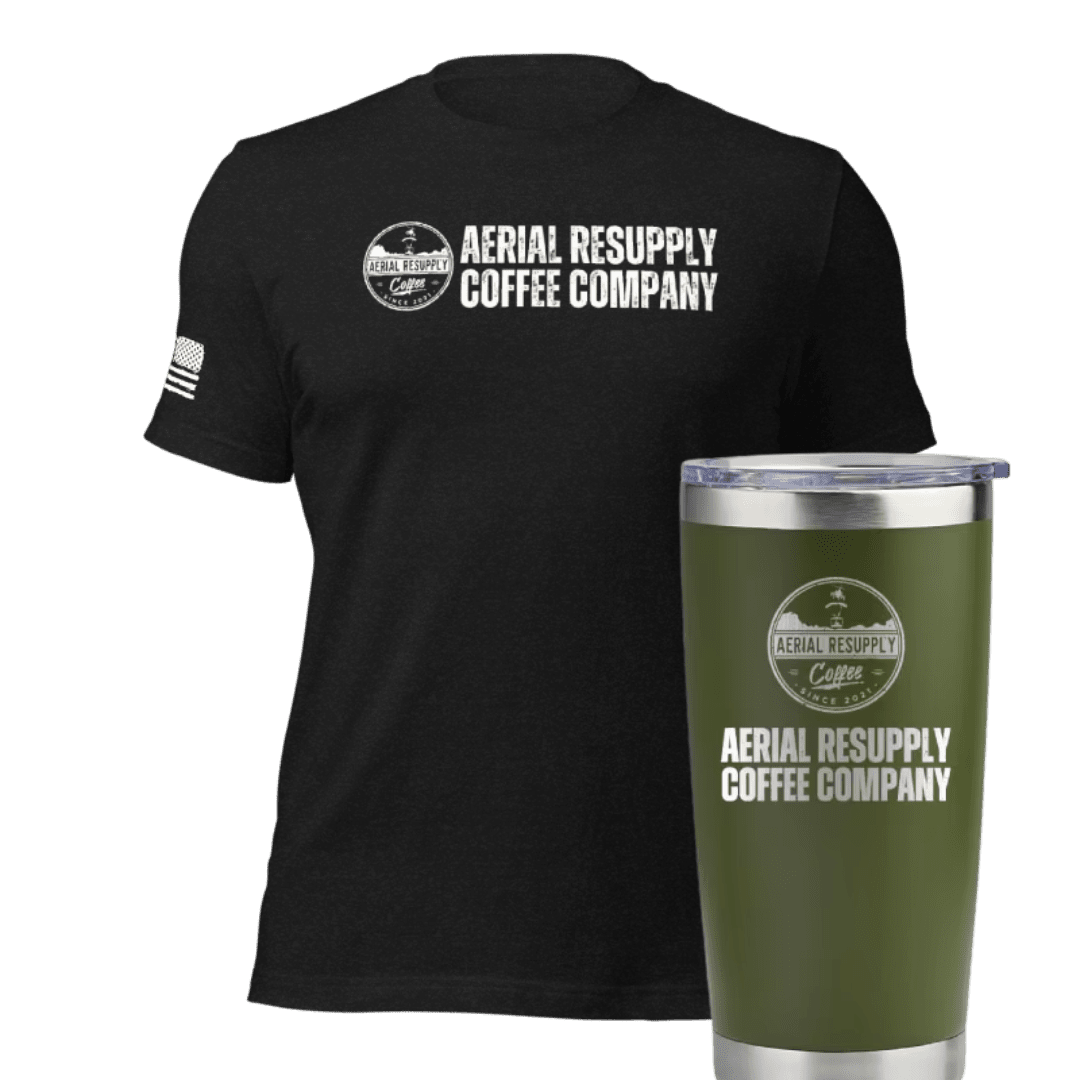 Gear up with the Patriot’s Essential Bundle, featuring the Aerial Resupply Coffee Company Logo T-Shirt and our top-rated Coffee Tumbler.