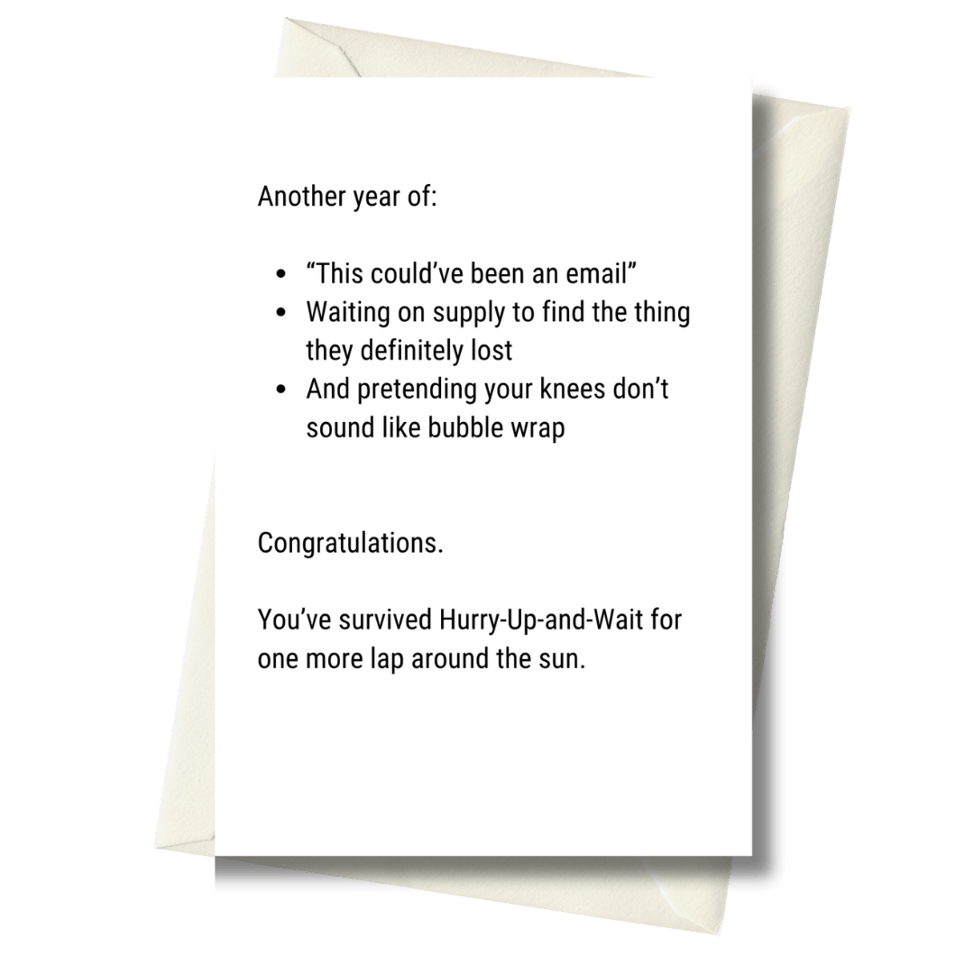 This card honors every grunt, clerk, mechanic, and logistician who’s been dumped on by Mother Nature and leadership at the same time. Perfect for anyone who ever heard “It’s just water” while becoming hypothermic.